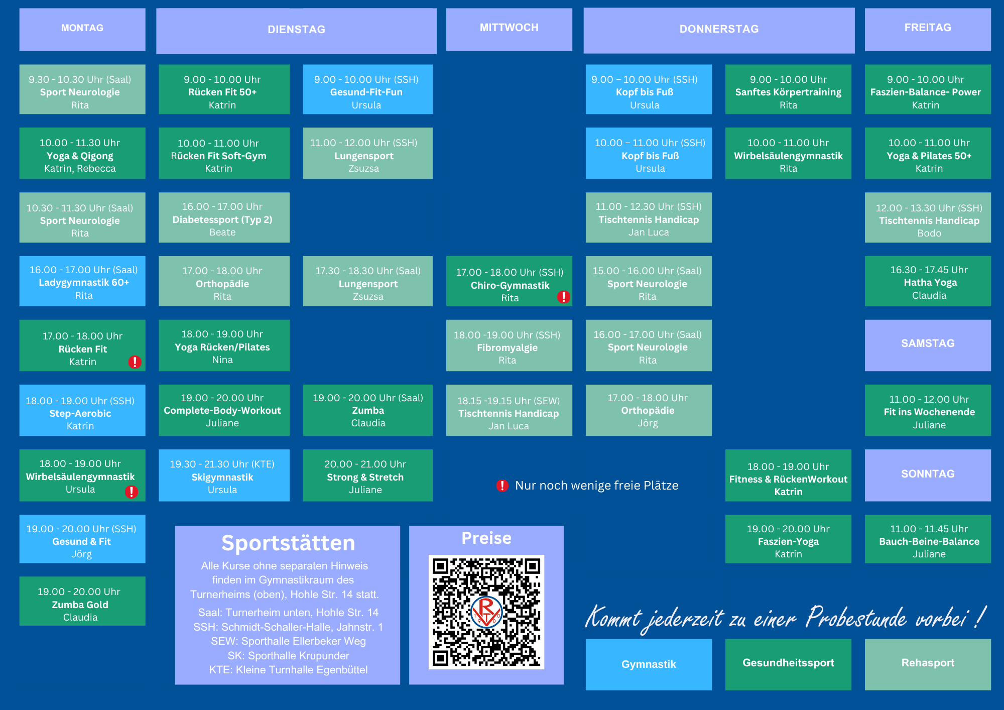 Der Einstieg in laufende Kurse ist jederzeit mit einer Probestunde möglich. Bitte beachtet, dass in einigen Kursen eine Warteliste besteht! Anfragen richtet ihr bitte an die RTV-Geschäftsstelle. Eine Übersicht über freie Plätze gibt über das entsprechende Ampelsymbol.
